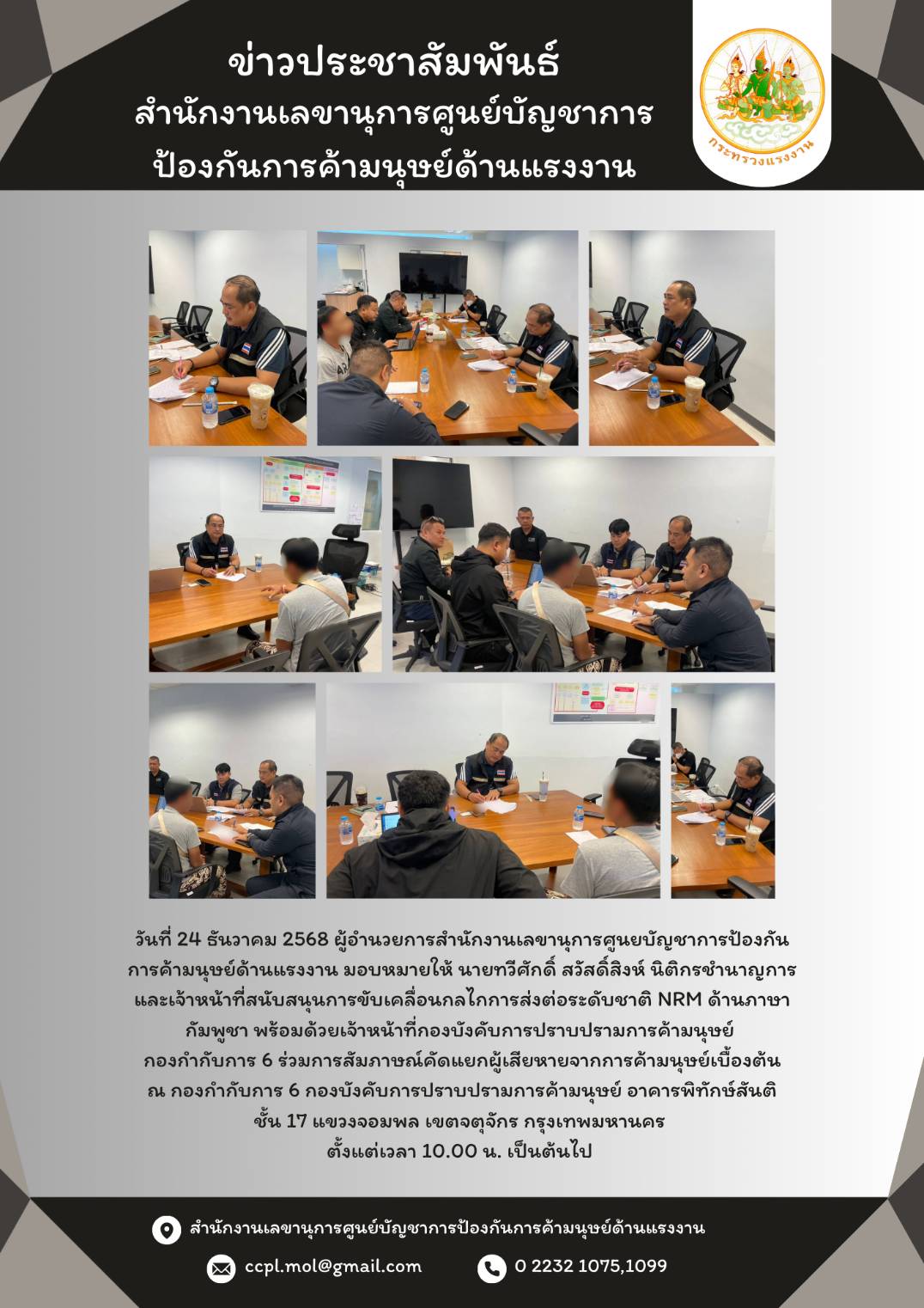 วันที่ 24 ธันวาคม 2568 สล.ศปคร. เข้าร่วมสัมภาษณ์คัดแยกผู้เสียหายจากการค้ามนุษย์เบื้องต้น ณ กองบังคับการ 6 ปคม.