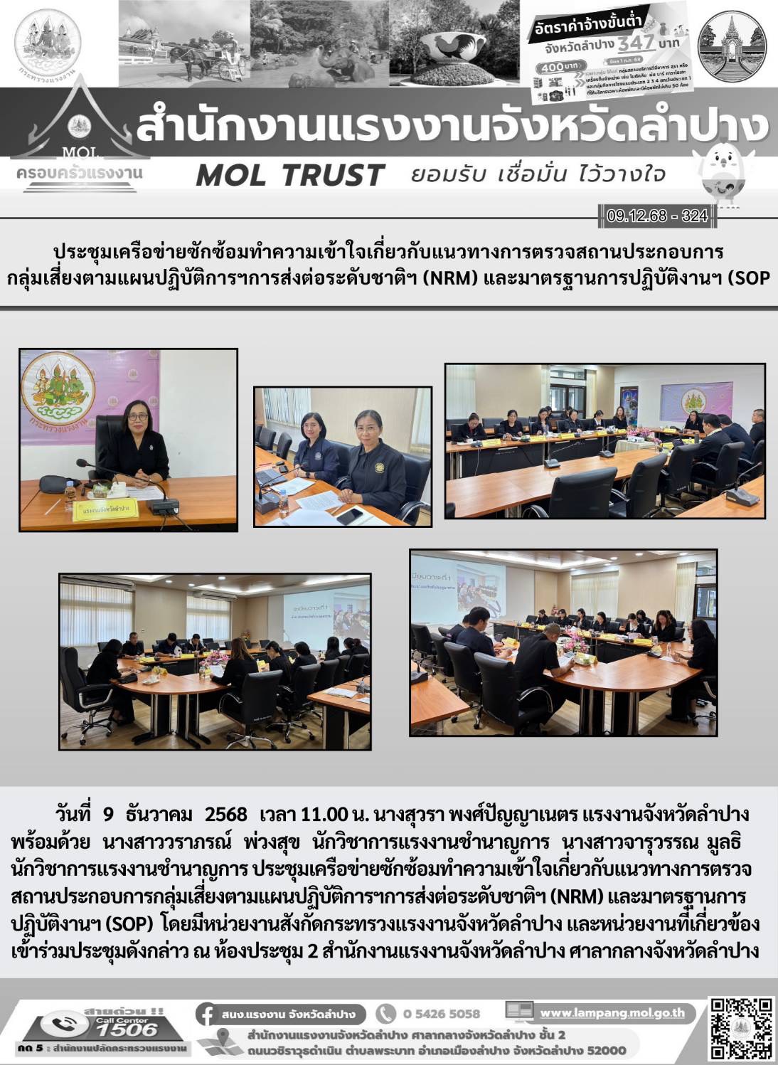 - วันที่ 9 ธันวาคม สรจ.ลำปาง ประชุมเครือข่ายซักซ้อมทำความเข้าใจเกี่ยวกับแนวทางการตรวจสถานประกอบการกลุ่มเสี่ยง