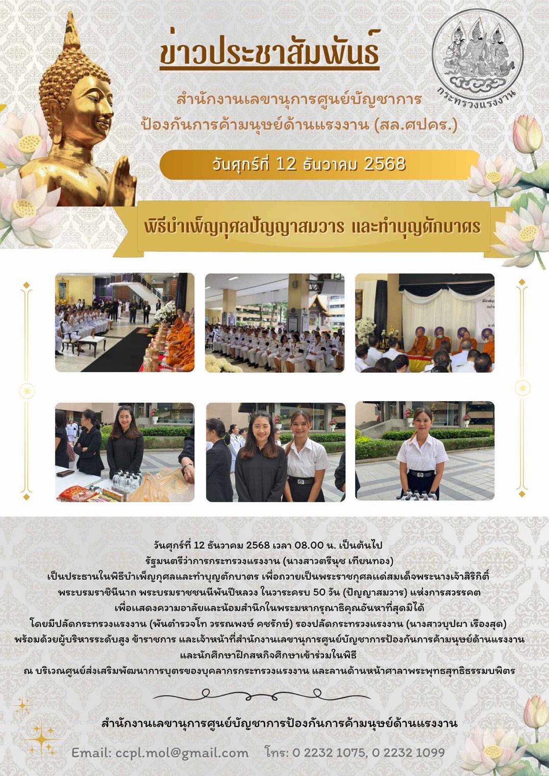 วันที่ 12 ธันวาคม 2568 สล.ศปคร. ร่วมพิธีบำเพ็ญกุศลปัญญาสมวาร และทำบุญตักบาตร สมเด็จพระบรามราชชนนีพันปีหลวง