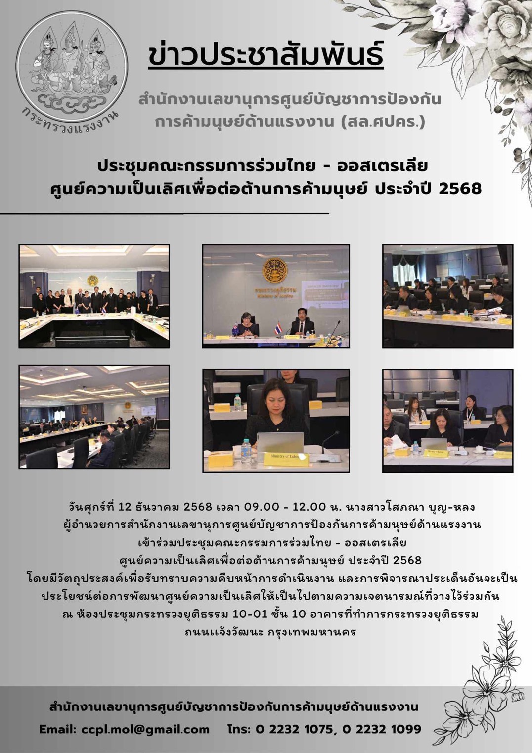 วันที่ 12 ธันวาคม 2568 สล.ศปคร.ประชุมคณะกรรมการร่วมไทย-ออสเตรเลีย ศูนย์ความเป็นเลิศเพื่อต่อต้านการค้ามนุษย์ ประจำปี 2568