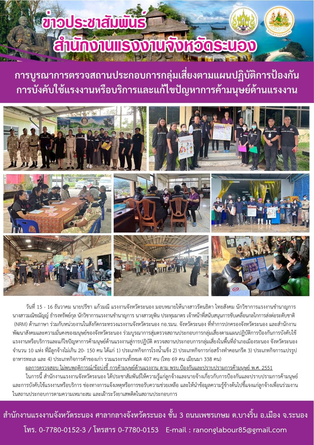 วันที่ 15 – 16 ธันวาคม สรจ.ระนองออกตรวจสถานประกอบกิจการกลุ่มเสี่ยงตามแผนปฏิบัติการป้องกันการบังคับใช้แรงงานหรือบริการฯ
