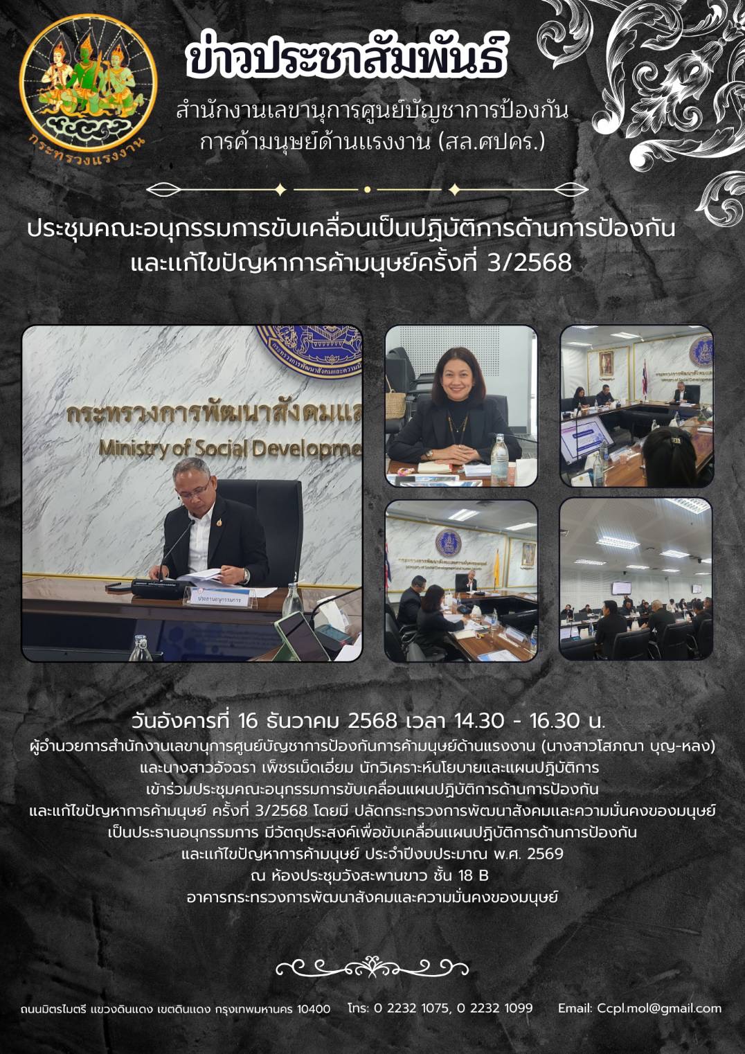 วันที่ 16 ธันวาคม 2568 สล.ศปคร. ประชุมคณะอนุกรรมการขับเคลื่อนเป็นปฏิบัติการด้านการป้องกันและแก้ไขปัญหาการค้ามนุษย์ครั้งที่ 3/2568
