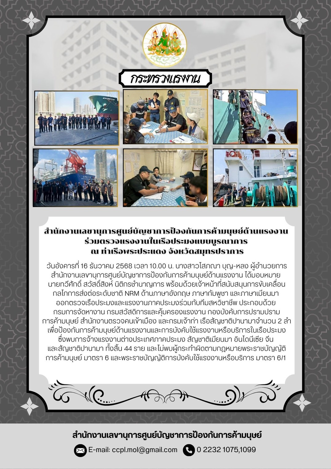 วันที่ 16 ธันวาคม 2568 สล.ศปคร. ร่วมตรวจแรงงานในเรือประมงแบบบูรณาการ ณ ท่าเรือพระประแดง จ.สมุทรปราการ