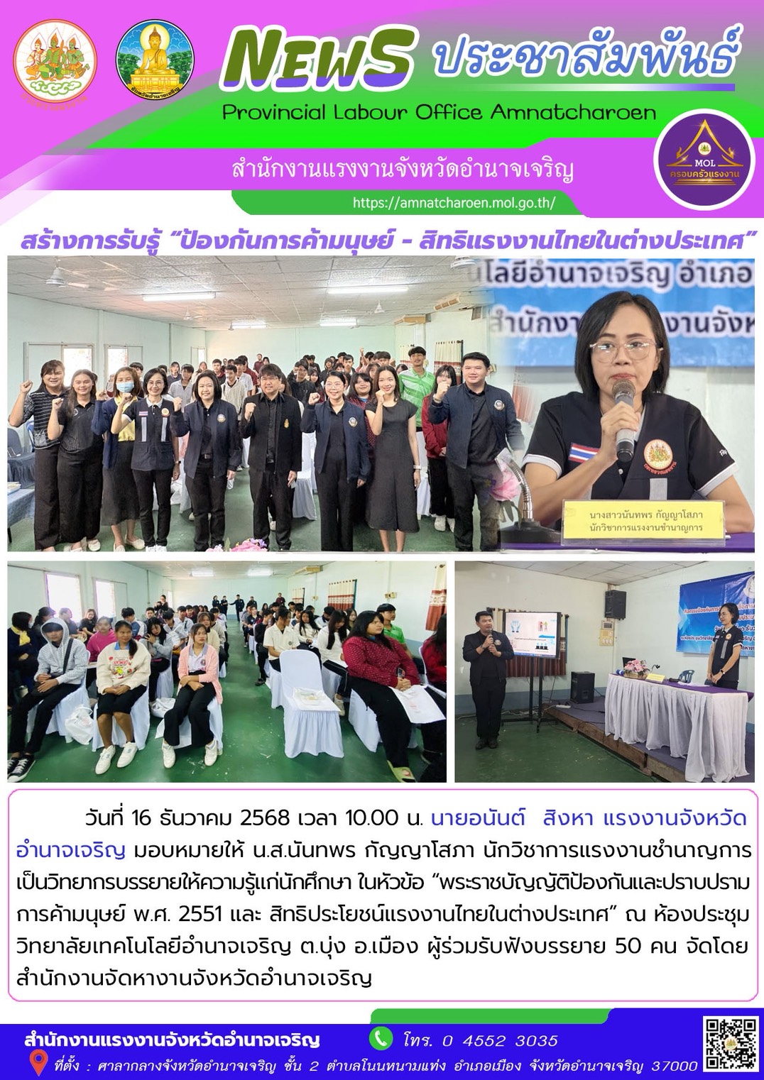 วันที่ 16 ธันวาคม 2568 สรจ.อำนาจเจริญ เป็นวิทยาการให้ความรู้แก่นักศึกษา ในหัวข้อ”พระราชบัญญัติป้องกันและปราบปรามการค้ามนุษย์ฯ