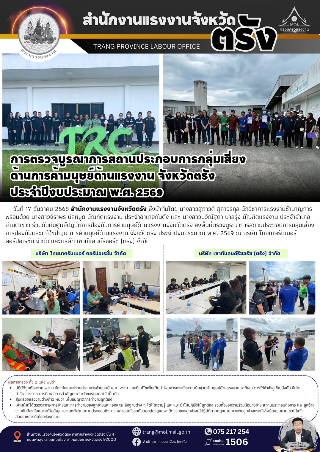 วันที่ 17 ธันวาคม 2568 สรจ.ตรัง ลงพื้นที่ตรวจบูรณาการสถานประกอบการกลุ่มเสี่ยงฯ จ.ตรัง ประจำปีงบประมาณ พ.ศ.2569