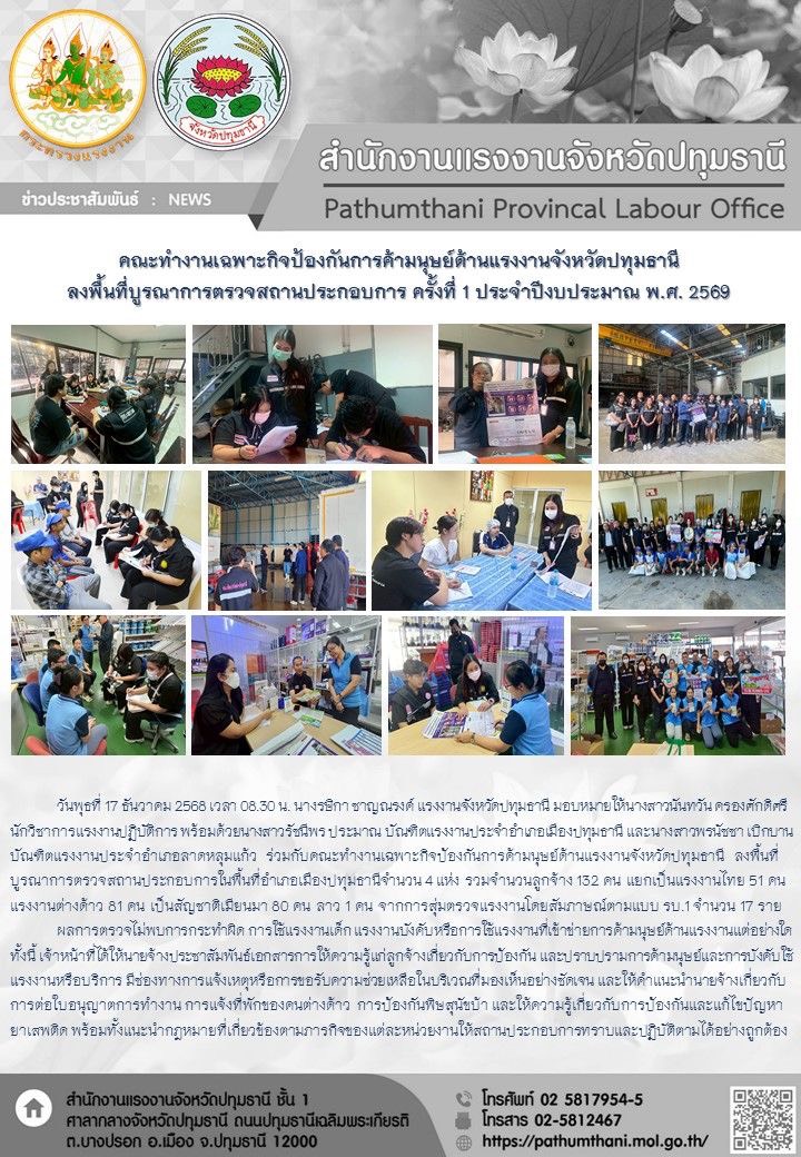 วันที่ 17 ธันวาคม 2568 สรจ.ปทุมธานี ลงพื้นที่ตรวจสถานประกอบการ ครั้งที่1 ประจำปีงบประมาณ พ.ศ.2569